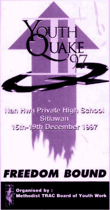 The Youth Quest for Unity and Koinoinia Enhancement, better known as YOUTHQUAKE, was held at the Nan Hwa (Private) High School, Sitiawan from the 15th till the 19th of December 1997. YOUTHQUAKE II was organised by the Board Of Youth Work of The Trinity Annual Conference of the Methodist Church in Malaysia (TRAC). The theme for this camp was "FREEDOM BOUND". a total of five NCOs of the 1st Penang Company Boys Brigade represented Trinity Methodist Church, Penang. All together there were nearly 350 participants from all over Malaysia as well as a few delegates from Singapore. The participants were divided into care groups under the leadership of selected volunteers. And as usual the boys and girls were housed in different dormitories during the camp. Among the highlights of this camp were the main sessions conducted by Rev. Lowell Sheppard and Andy Harrington, both members of an organisation called Youth For Christ (YFC). Numerous workshops were also arranged to meet the different needs of the participants. There was also a concert by the Bethany Singers from Jakarta as well as a Youth Rally. Beside all of these there was also a basketball competition and a dance drama by the Canning Garden Methodist Church , Ipoh entitled "The Toy Makers Dream" . On the last night of the camp, we all had a Street Party which lasted way into the night. We were fortunate to be able to witness a somewhat acrobatic performance by Team Rollerblade Malaysia that night. Throughout the duration of the camp, the presence of the Lord was working in our midst. This was evident in the large number of participants who were moved to become new believers who as well as to rededicate their lifes to the Lord. As we worshipped together with our fellow Christian brothers and sisters we were reminded that we are not alone in our daily Christian Walk. This camp also unearthed some hidden talents of our members. Some showed off their "Buaya" skills while others were just content to stretch their vocal chords and dance away. Nevertheless, new friends were made and old bonds reacquainted. The outing to the Lumut Naval Base was also an exciting eye-opener. On the last day of the camp, we, members of the 1st Penang Company Boys Brigade had reason to be proud as two of us were presented the prestigious Tokoh Belia Methodist Award. They were namely former Sgt. Victor Abel Malayapillay & Sgt. Daniel Khoo Chen Yao. We had even more reason to celebrate as there were only 5 such awards presented this time. As the camp drew to an end, we all found it hard to say goodbye. Addresses were exchanged and hugs were given. Promises to keep in touch were made with echoes of Merry Christmas in the background. Truly we all departed from Sitiawan Changed and Different from how we had first arrived. "I will never be, the same again.....".